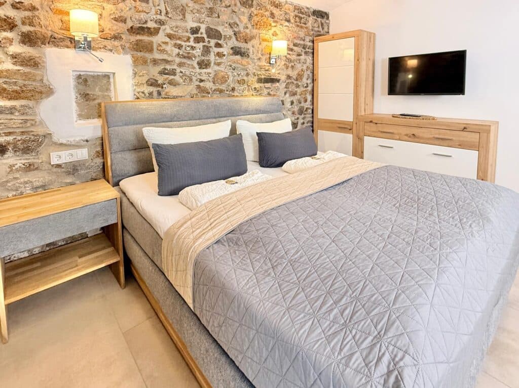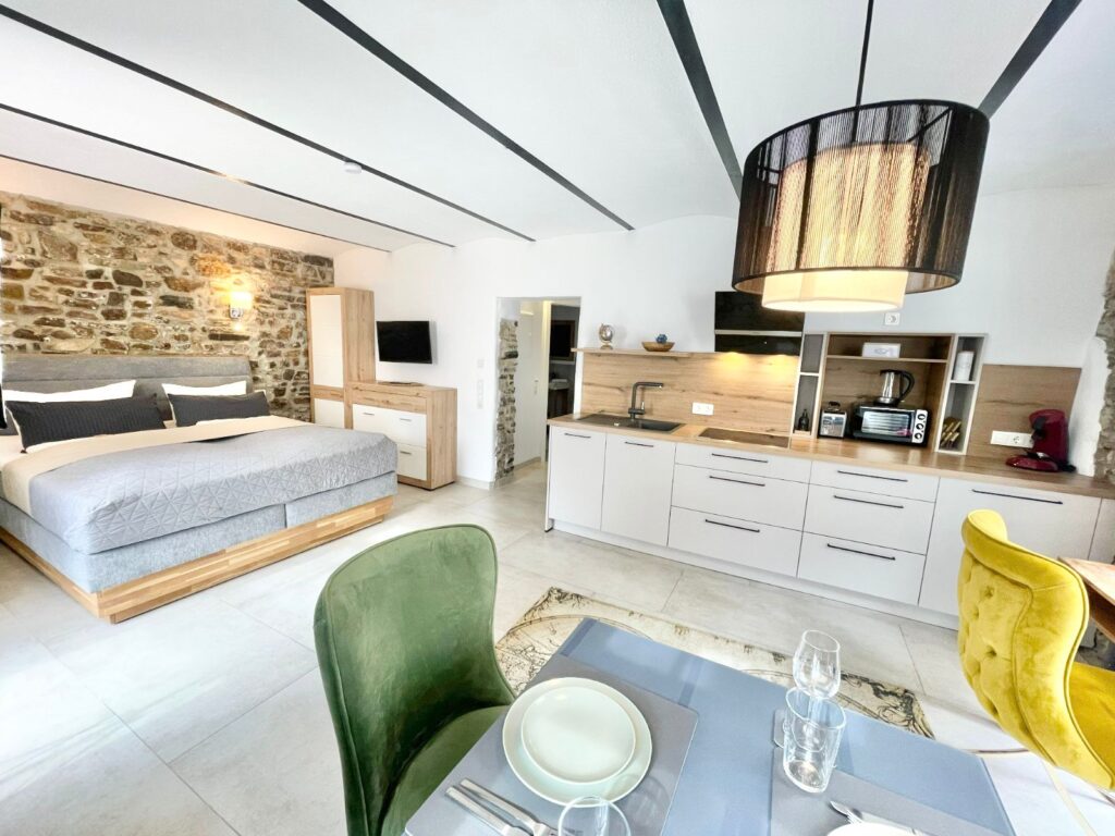 Offener Bruchstein, natürliche Materialien und eine ruhige Farbgestaltung schaffen eine besondere Atmosphäre -Ideal für Gäste, die Wert auf Ruhe, Design und Qualität legen.