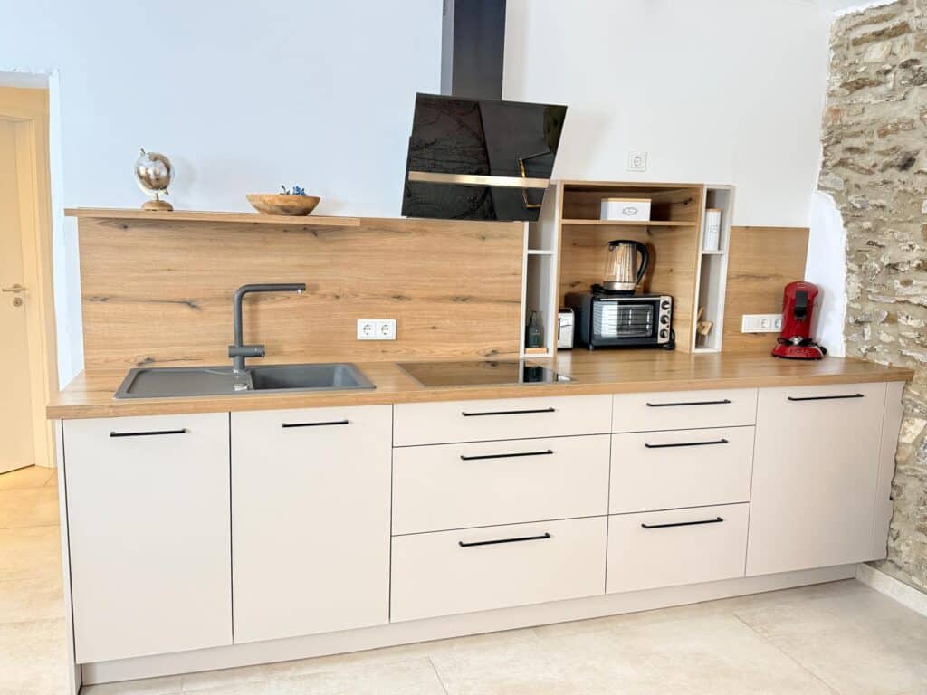 Die moderne Küche ist vollständig ausgestattet und bietet alles, was Sie für einen komfortablen Aufenthalt benötigen: