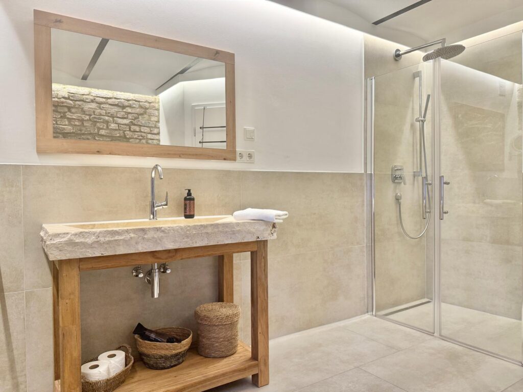 Das Badezimmer überzeugt durch eine klare, moderne Gestaltung und hochwertige Materialien. Eine ebenerdige Dusche und ein massives Natursteinwaschbecken sorgen für ein ruhiges, spa-ähnliches Ambiente.