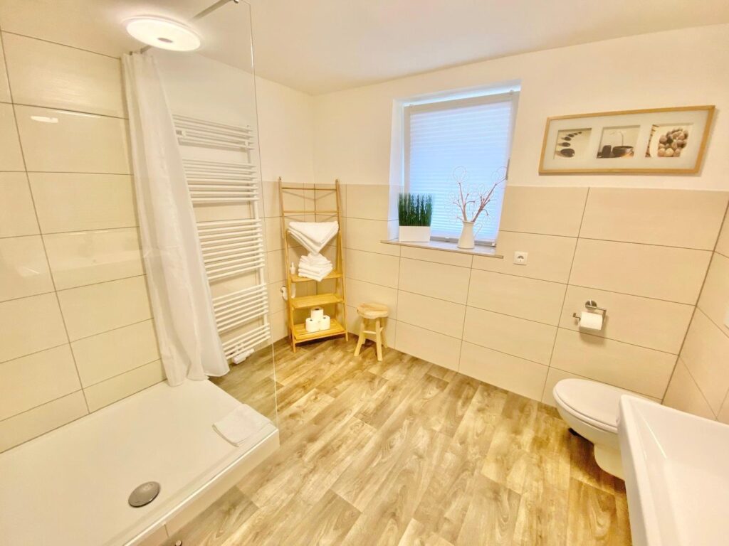 Das moderne Badezimmer mit großzügiger Walk-In-Dusche rundet das Wohngefühl ab – klar, hochwertig und angenehm ruhig.