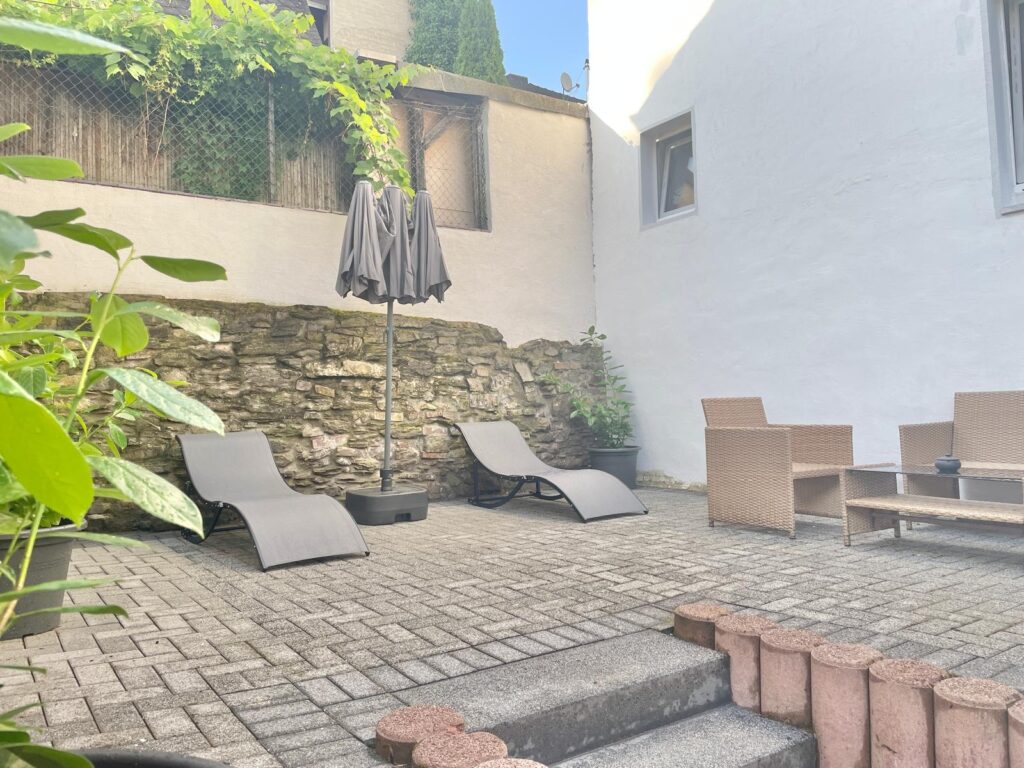 Ob beim Frühstück in der Morgensonne, beim Lesen am Nachmittag auf der Sonnenliege oder bei einem Glas Wein aus den nahegelegenen Weindörfern an Rhein und Mosel am Abend – die Terrasse lädt dazu ein, langsamer zu werden und den Augenblick zu genießen. Umgeben von historischem Mauerwerk und der besonderen Atmosphäre Alt-Sayns entsteht ein Gefühl von Geborgenheit und Ruhe.