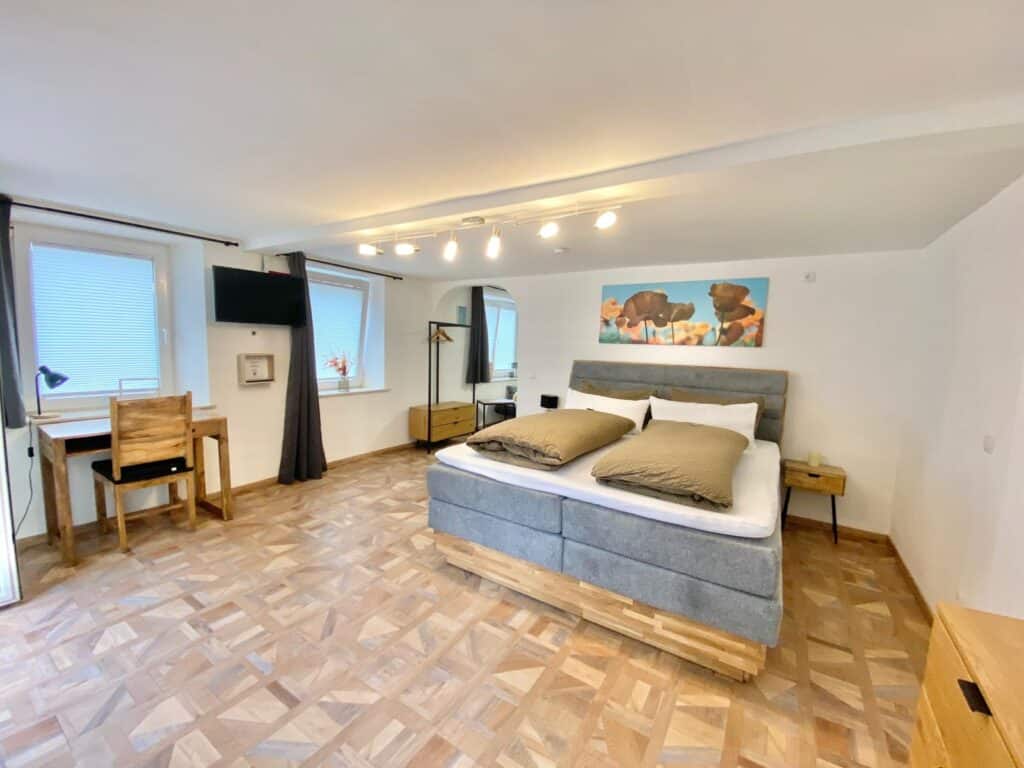 Ein komfortables Boxspringbett (180 x 200 cm) sorgt für erholsame Nächte in unserer Ferienwohnung Kleinôd Bendorf Sayn, während der lichtdurchflutete Wohnbereich mit Schlafcouch Raum zum Lesen, entspannen oder verweilen bietet.